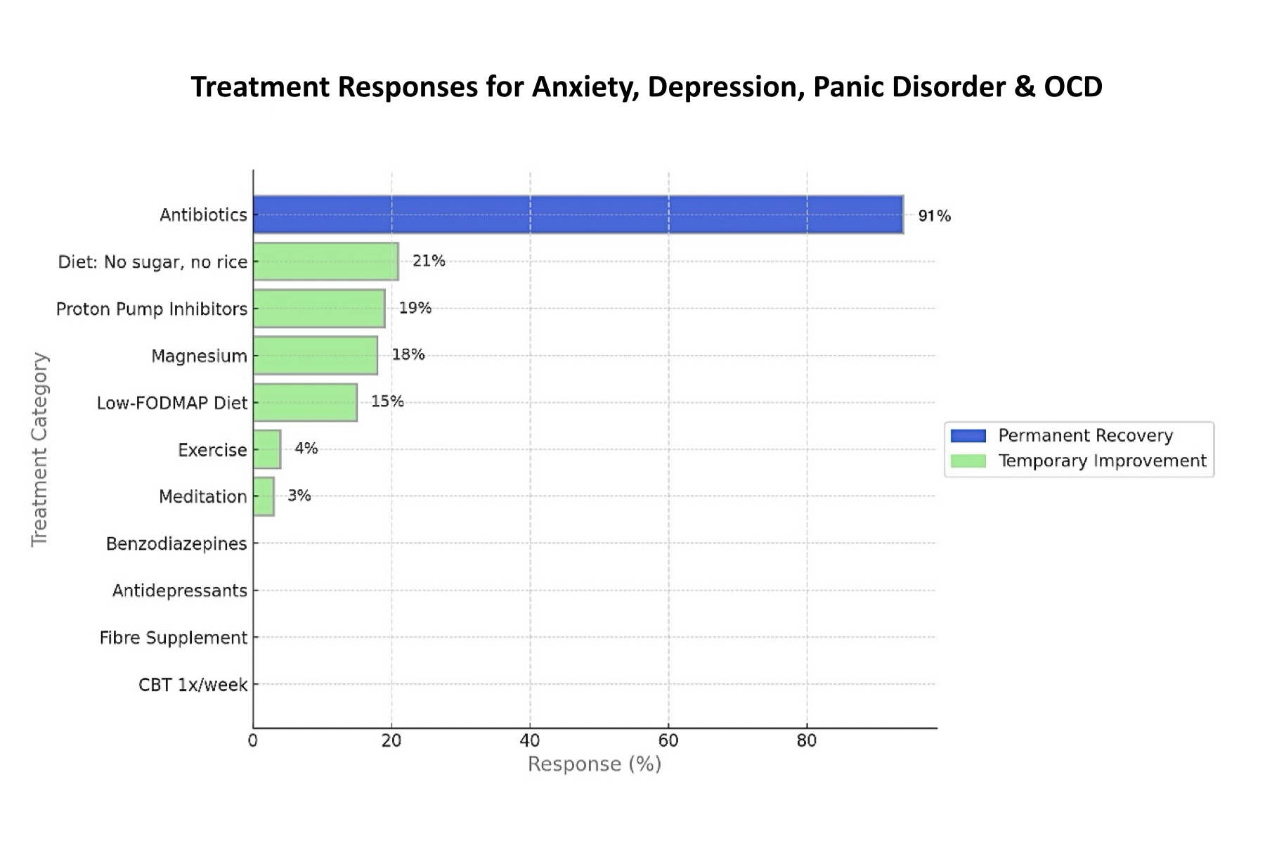 Findings demonstrate a direct link between gut pathogens and anxiety, depression, panic disorder and OCD. Antibiotics were highly effective, and natural remedies eliminated residual symptoms. This supports the gut-brain axis as a mechanism in mental health and suggests a paradigm shift from symptom management to symptom resolution.
